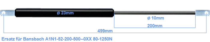 Ersatz Gasdruckfeder für Bansbach A1N1-52-200-500--0XX 80-1250 Newton. Die Stärke des Auges beträgt 10mm und der Lochdurchmesser ist 8.1mm. Marke: Hahn Gasfedern.