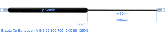 Ersatz Gasdruckfeder für Bansbach A1N1-52-300-700--0XX 80-1250 Newton. Die Stärke des Auges beträgt 10mm und der Lochdurchmesser ist 8.1mm. Marke: Hahn Gasfedern.