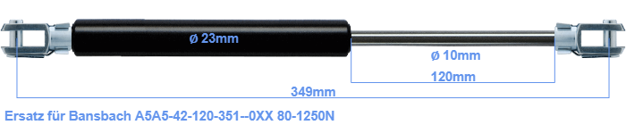 Ersatz Gasdruckfeder für Bansbach A5A5-42-120-351--0XX 80-1250 Newton. Der Gabelkopf hat einen Lochdurchmesser von 8.1mm. Marke: Hahn Gasfedern.